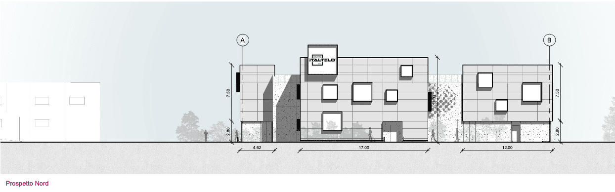 Highly technological, energy-efficient building integrated into its surroundings, reflecting the identity of its client. Italtelo S.p.A. is a company based in Montichiari, Brescia, and a leader in the design and production of digital prints, setups for sporting and trade fair events, and the sale of video walls.